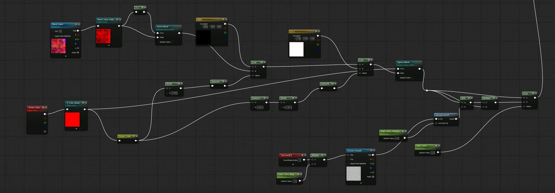 The masking helped the scene feel much more detailed, but then I realized my layered materials weren’t separating enough in depth. I didn’t want to rely on displacement for material blending, so I looked for other options. Using the Perturb Normal material function ended up giving me what I needed. It’s performance heavy and resolution dependent, so it’s not ideal for an actual game, but for a scene like this it worked perfectly. I also blend a noise map to adjust the edge mask quality to help my vertex painting from looking too soft.[4a] [4b]